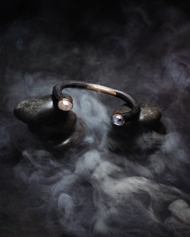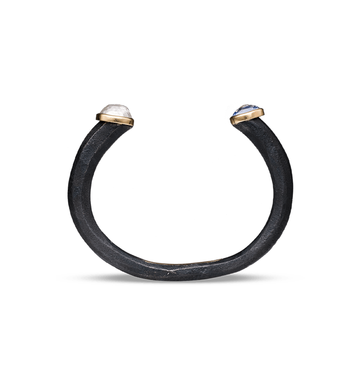 Der "Eisenhower Doble" Armreif ist gearbeitet in 18 Karat Roségold und Stahl während es an beiden Enden mit Edelsteinen besetzt ist. Auf der einen Seite mit einem Diamanten im Kissen-Schliff von insgesamt 4.38 Carat und auf der anderen Seite mit einem blauen Saphir im Oval-Schliff zu insgesamt 2.63 Carat.
