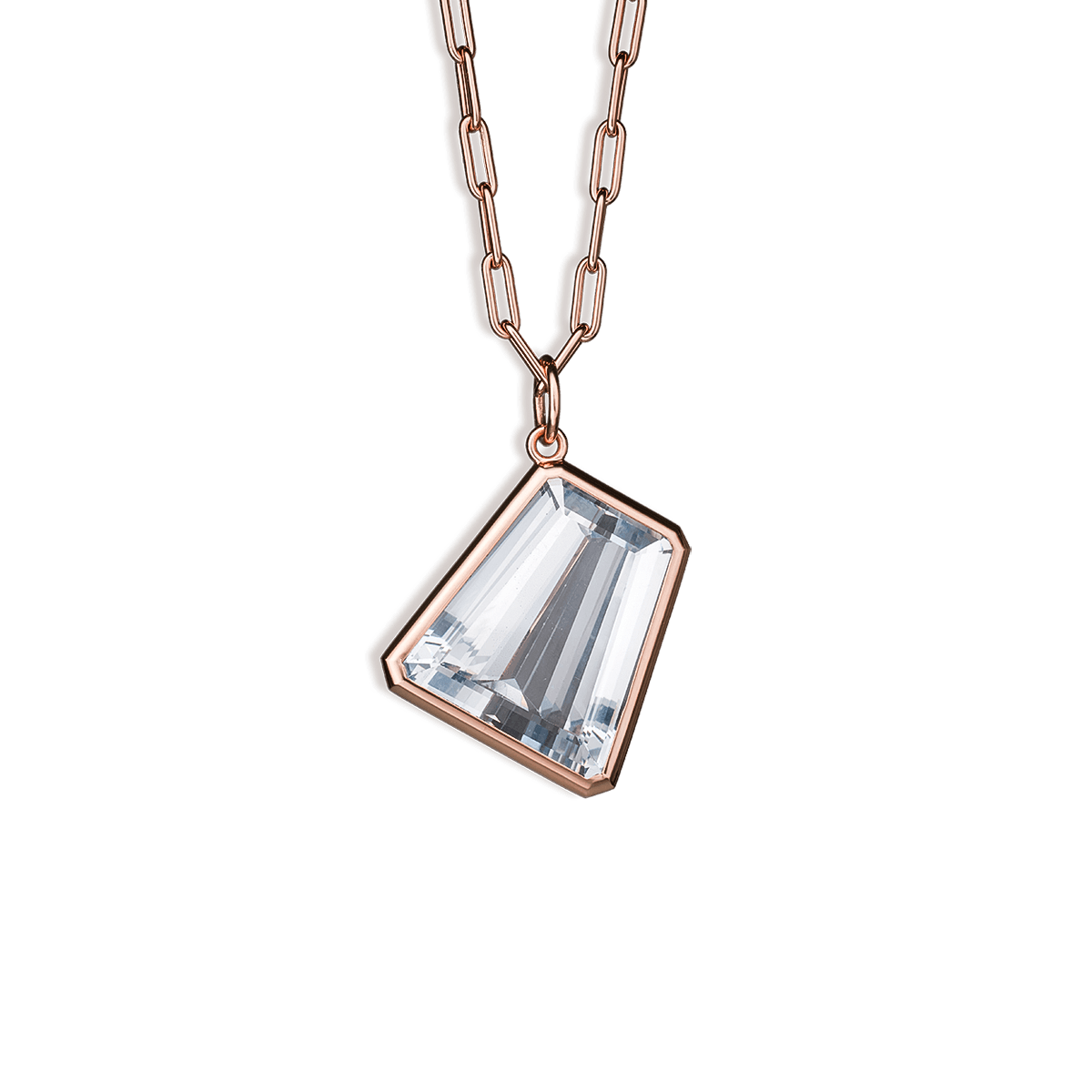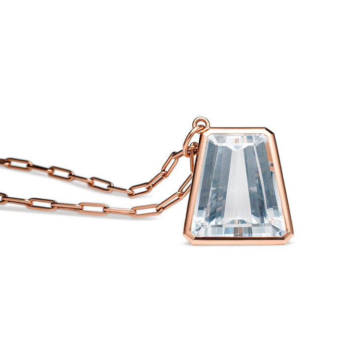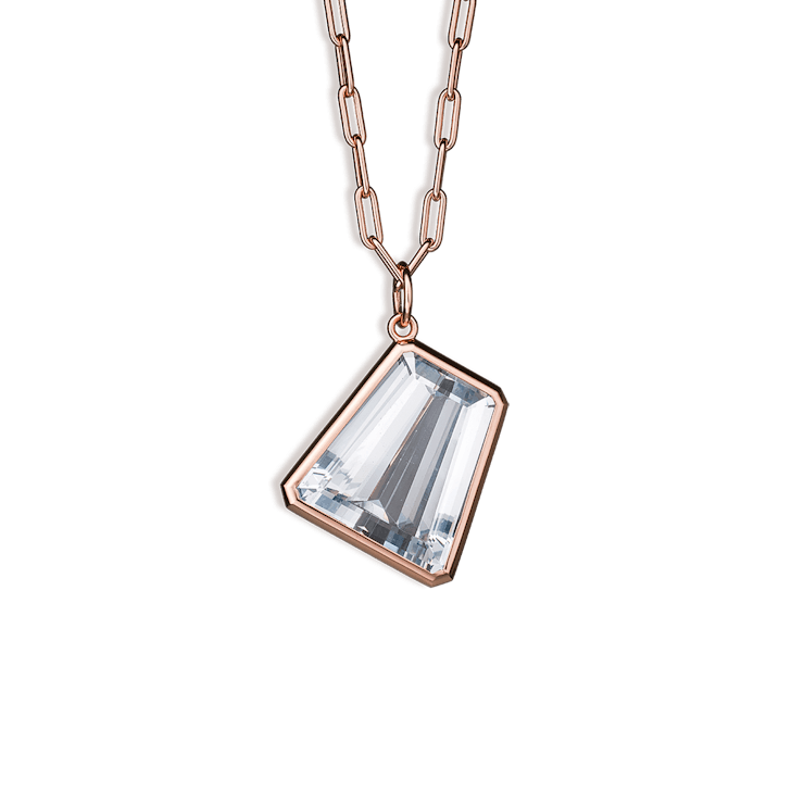 Der "Prisma" Anhänger ist gearbeitet in 18 Karat Roségold und ich besetzt mit einem Bergkristall im Fancy-Schliff von insgesamt 117 Carat. Die Halskette ist separat erhältlich.