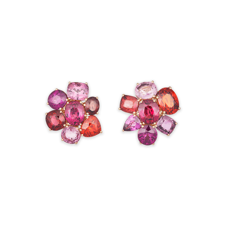 Die Azter Rosa Ohrringe sind gearbeitet in 18 Karat Roségold und besetzt mit Saphiren von insgesamt 4,35 Carat, Granaten von 9,64 Carat, Rhodolithen von 21,70 Carat und Mandaringranaten von 7,49 Carat.