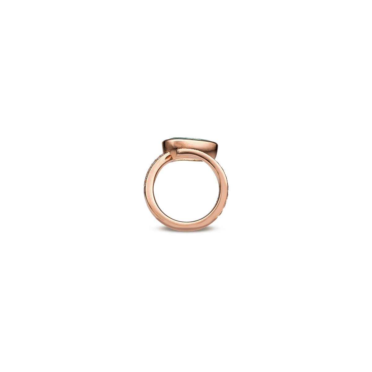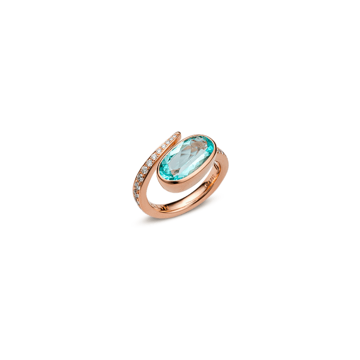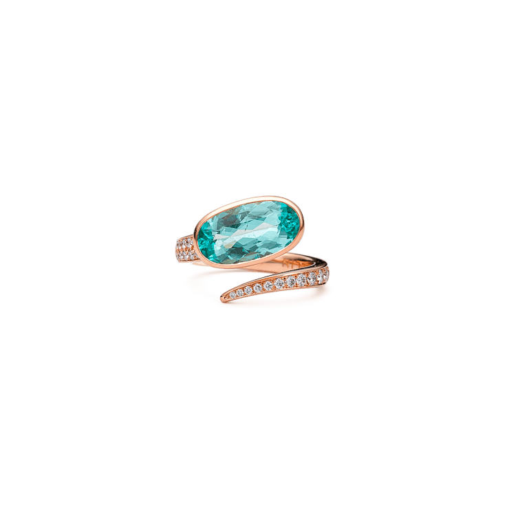 Der "Spira" Ring ist gearbeitet in 18 Karat Roségold und ist besetzt mit Diamanten im Brillant-Schliff zu insgesamt 0,48 Carat und mit einem Paraíba Turmalin im Oval-Schliff zu insgesamt 3,17 Carat.