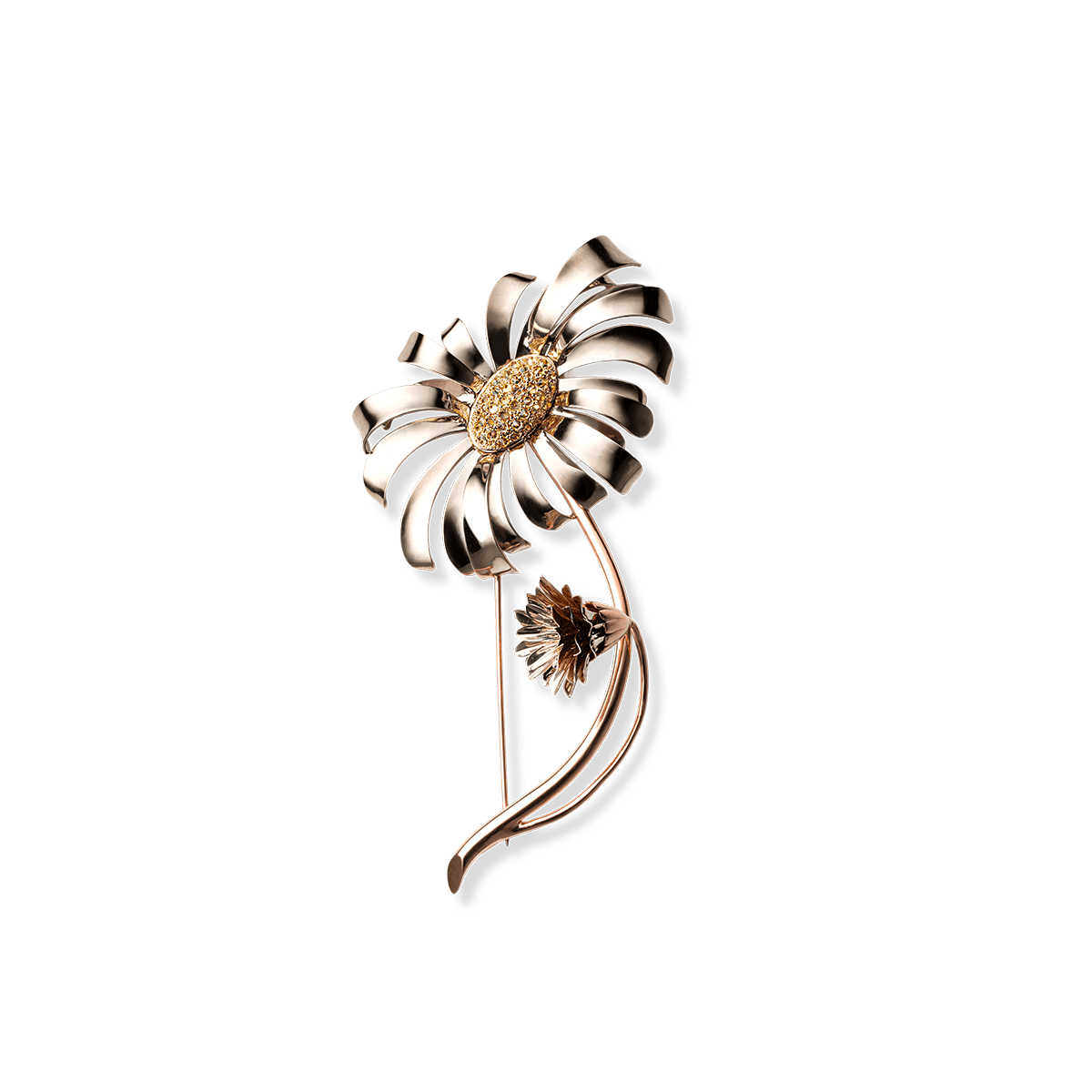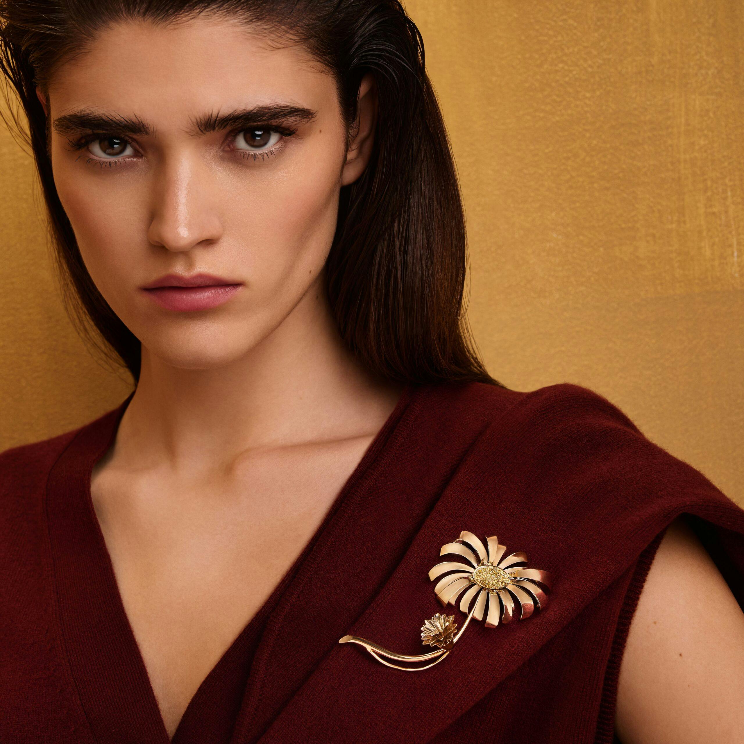 Die "Flora" Brosche ist gearbeitet in 18 Karat Gold und ist besetzt mit Saphiren im Brillant-Schliff.