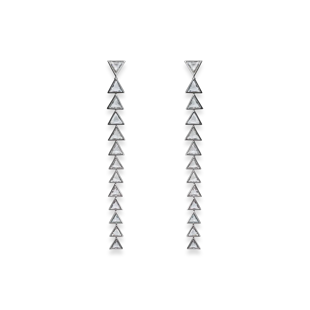 Die „Apex“-Ohrringe sind in 18 Karat Weißgold gefertigt und mit 26 weißen Saphiren im Triangel-Schliff mit einem Gesamtgewicht von 23,00 Carat besetzt.