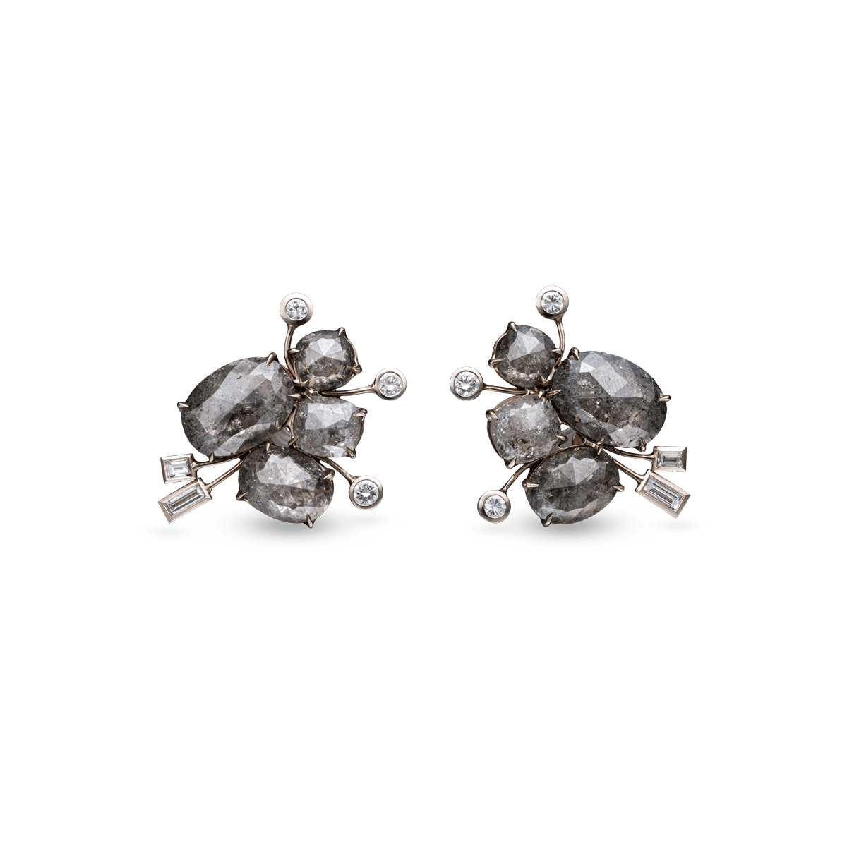 Die "Kosmo" Ohrringe sind gearbeitet in 18 Karat Weißgold und sind besetzt mit grauen Diamanten im Rosen-Schliff zu insgesamt 21,37 Carat sowie weiteren Diamanten im Brillant- und Baguette-Schliff.