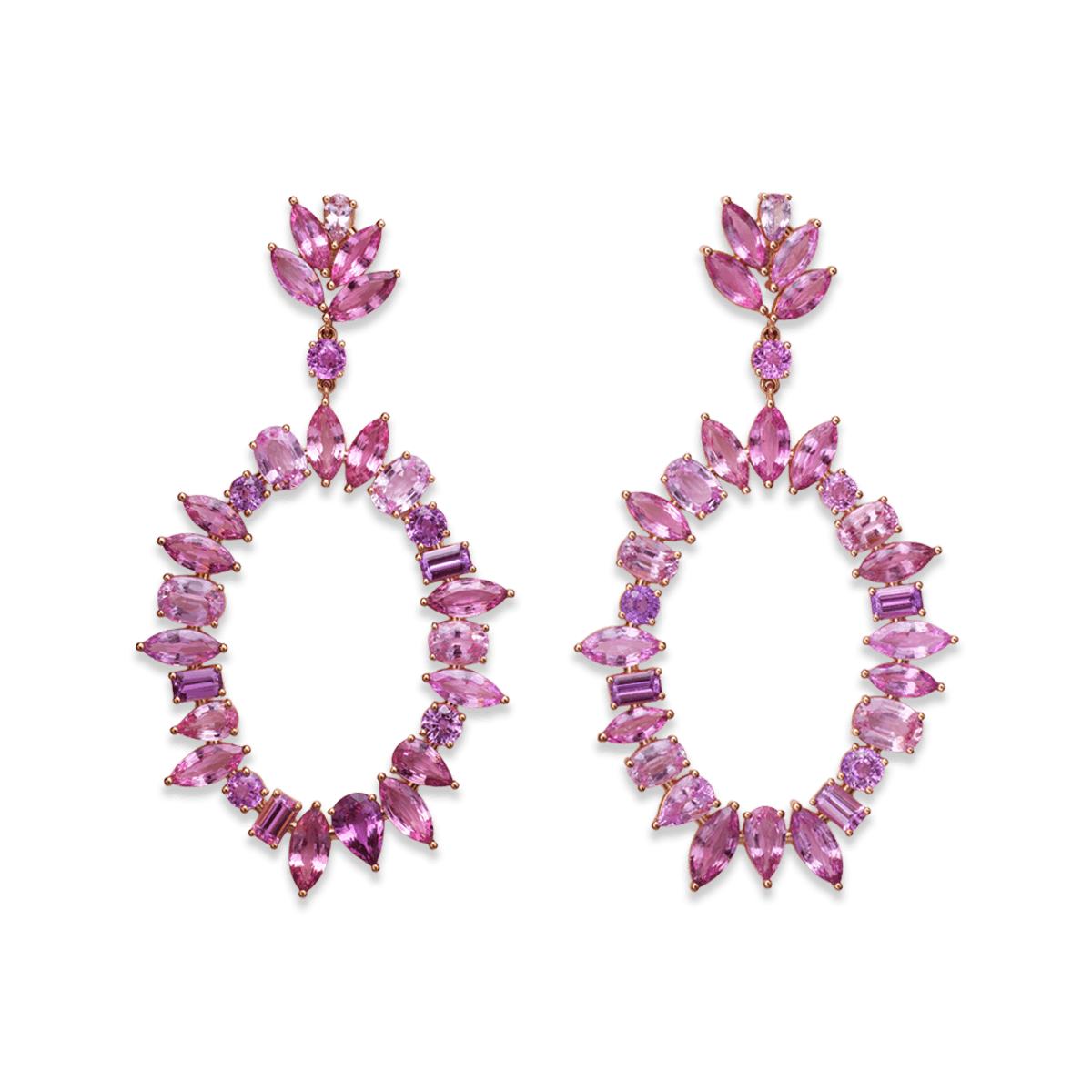 Die "Thornelle" Ohrringe sind gearbeitet in 18 Karat Roségold und sind besetzt mit rosa Saphiren in diversen Schliffen zu insgesamt 31,40 Carat.