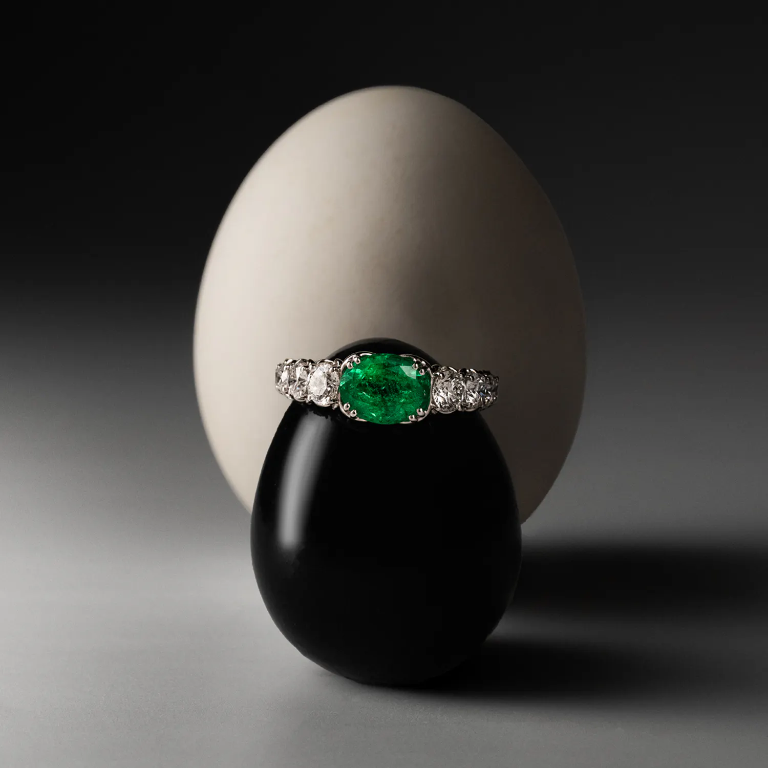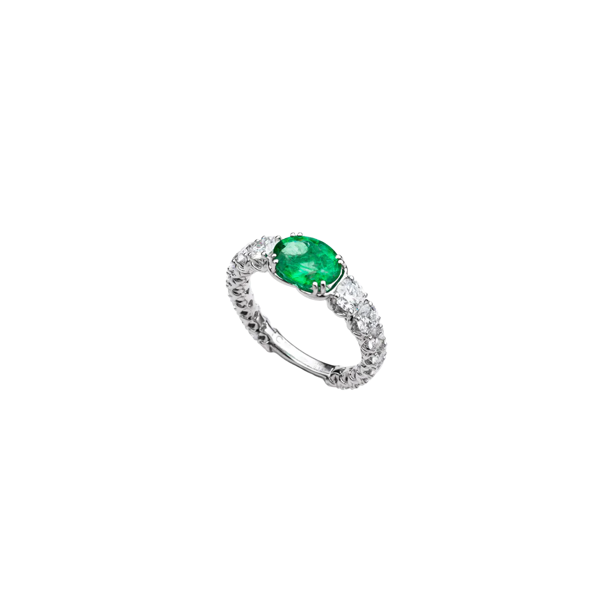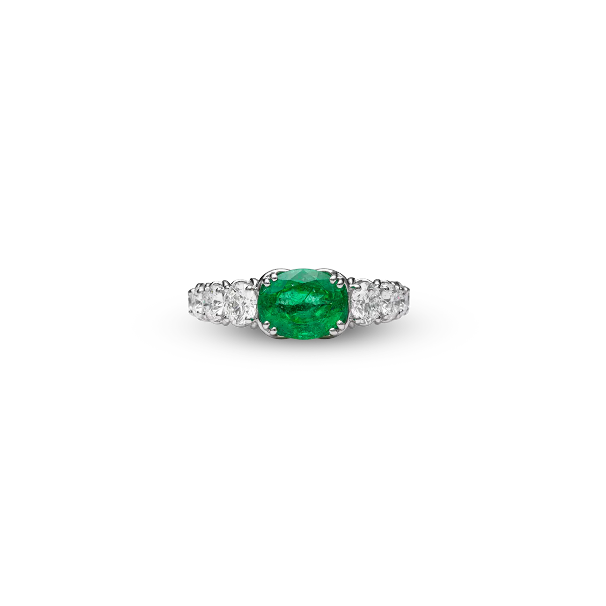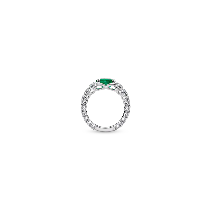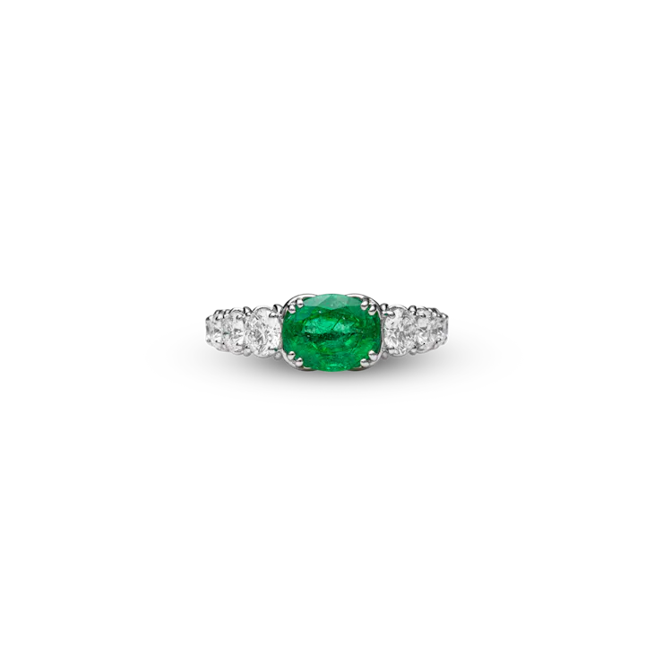 Der "Esmera" Ring ist gearbeitet in 18 Karat Weißgold und ist besetzt mit einem Smaragd im Oval-Schliff von insgesamt 1,57 Carat und mit Diamanten im Brillant-Schliff zu insgesamt 1,88 Carat.