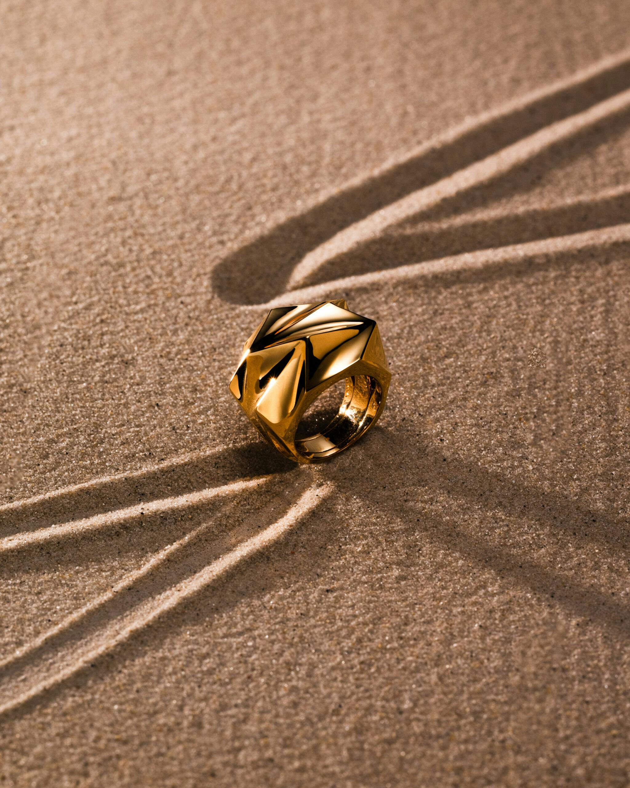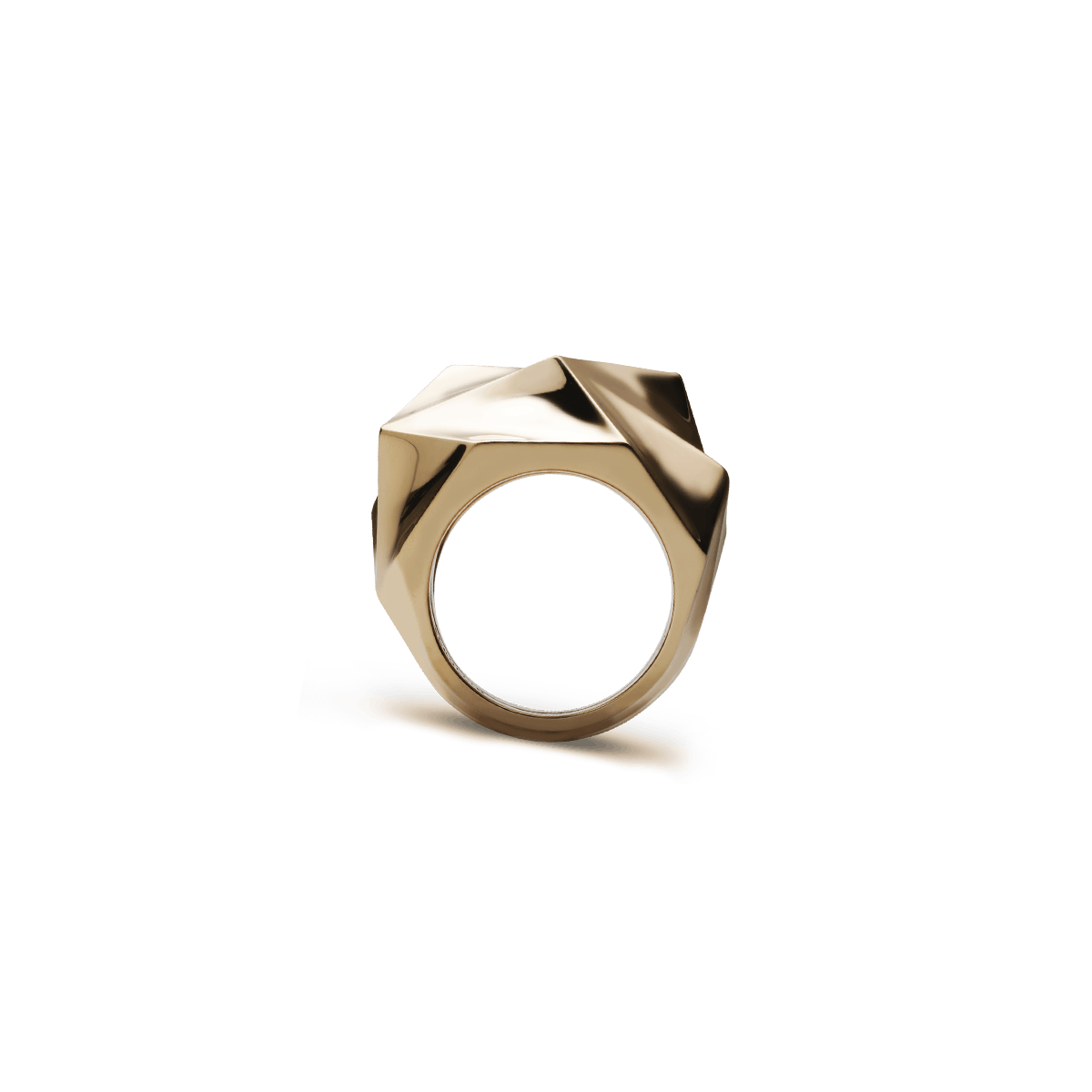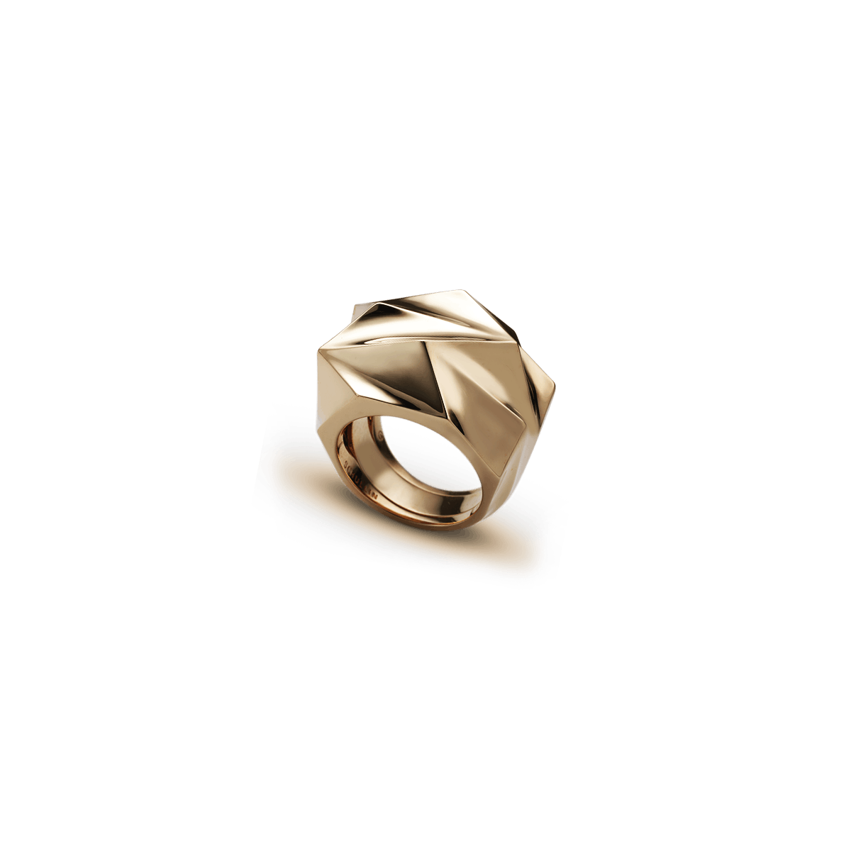 Entdecken Sie das Heptagon, das der Faszination für Geometrie und architektonische Formen folgt. Inspiriert von der berühmten geometrischen Form, hat Schullin deren Winkel verzerrt, um einen auffälligen, robusten Goldring zu kreieren.