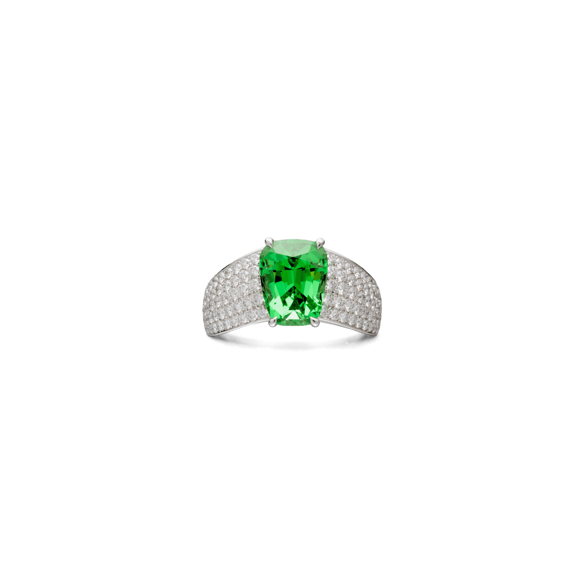 Der "Kite" Ring ist gearbeitet in 18 Karat Weißgold und ist besetzt mit einem grünen Tsavorit im Fancy-Schliff zu 5,19 Carat sowie 110 Diamanten im Brillant-Schliff zu insgesamt 1,44 Carat.