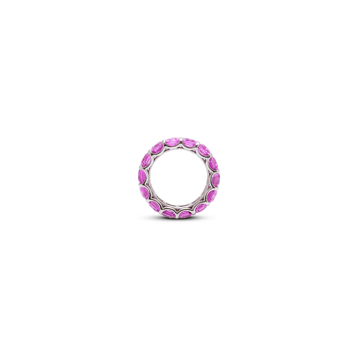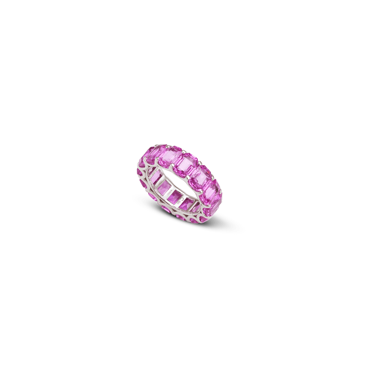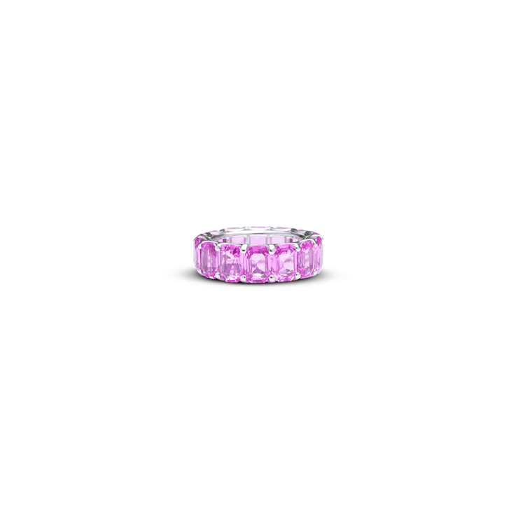 Der Memory rosa 16.52 Ring ist aus 18 Karat Weißgold gefertigt und mit 14 atemberaubenden rosafarbenen Saphiren besetzt, die den gesamten Ring umschließen. Die rosafarbenen Saphire wurden sorgfältig nach ihrer leuchtenden Farbe und Reinheit ausgewählt, farblich abgestimmt und speziell in einer schönen Baguette-Form für diese stilvolle Pave-Fassung geschliffen. Das Besondere an dem Memory Rose ist, dass die Saphire fast rubinrot sind, was ihm eine außergewöhnliche Note verleiht. Dieser Ring eignet sich perfekt als Symbol für ewige Liebe oder als Farbakzent zu jedem Outfit.