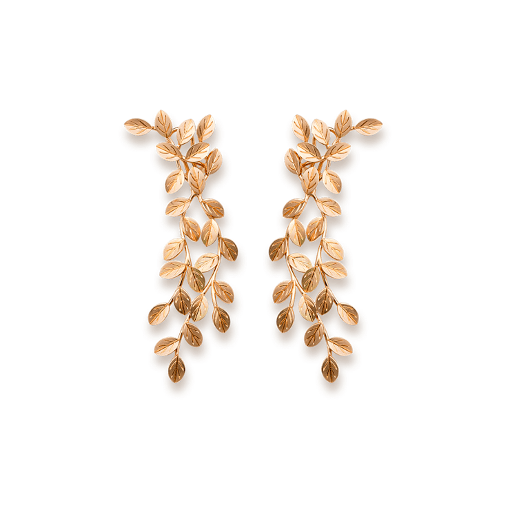 The "Vine" earrings are crafted in 18-karat yellow gold, set with a filigree leaf design reminiscent of a vine.
