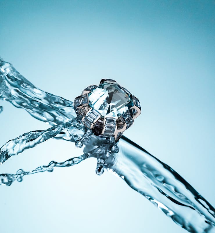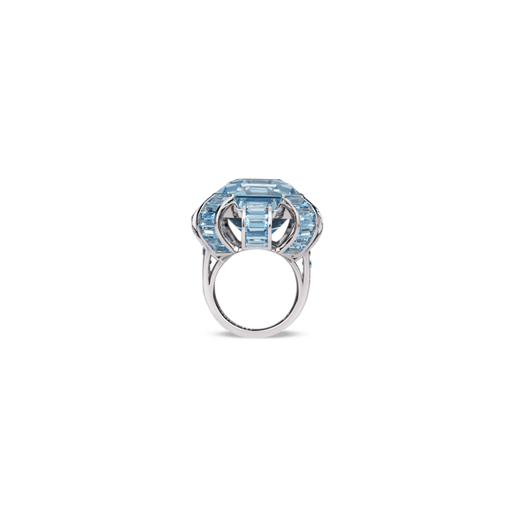 The "Bombé Blu" ring is crafted in 18-karat white gold and set with aquamarines in different shapes. Emerald-shaped aquamarines totalling 7.65 carats are set into the sides of the setting, while a baguette-shaped aquamarine totalling 31.48 carats stands out in the centre.