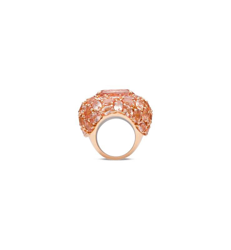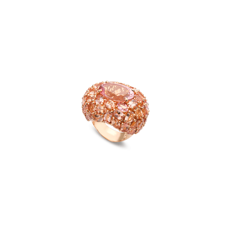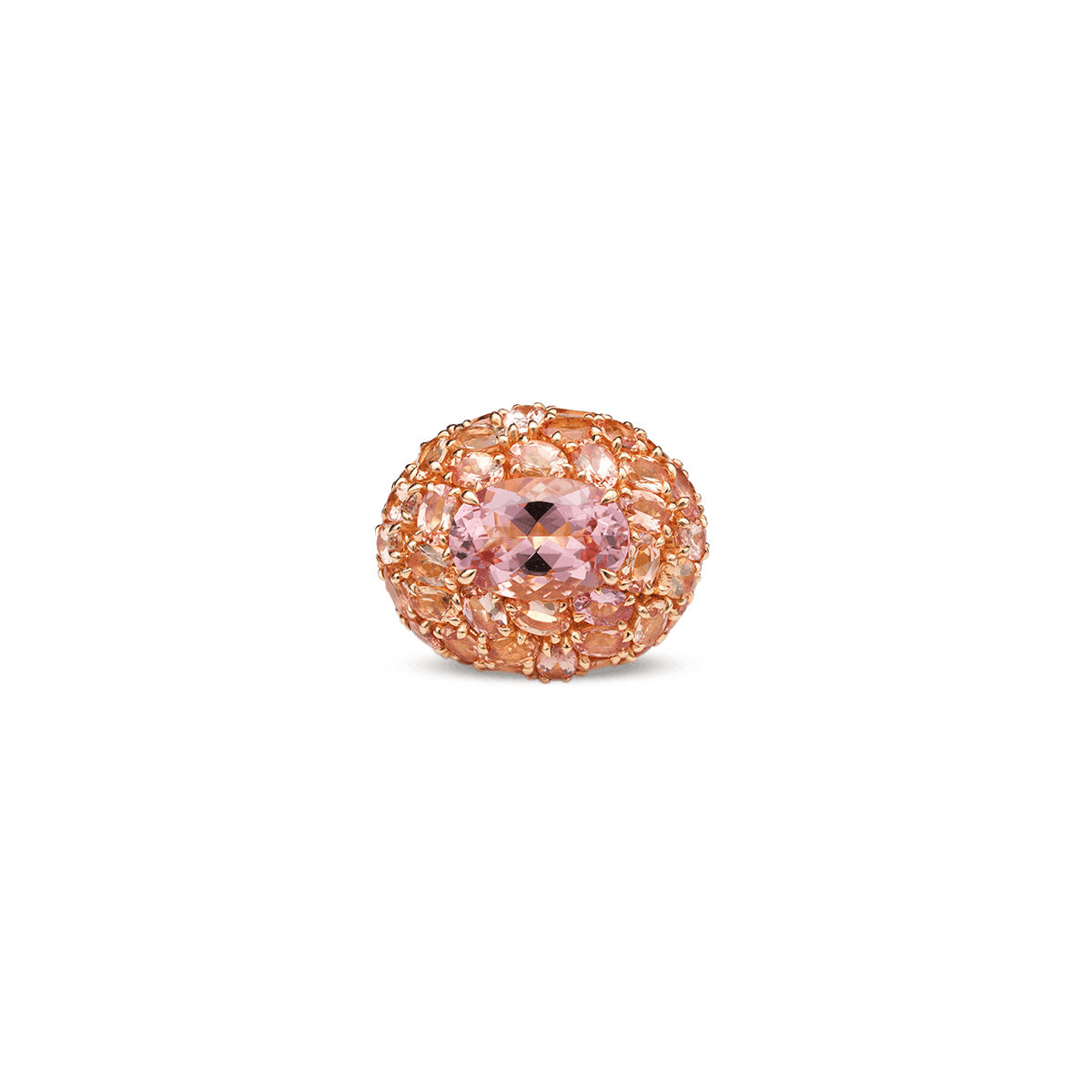 The "Fire Topaz II" ring is crafted in 18-karat rose gold and set with an oval morganite of 8.85 carats in the centre and 56 oval topazes totalling 27.13 carats on the setting.