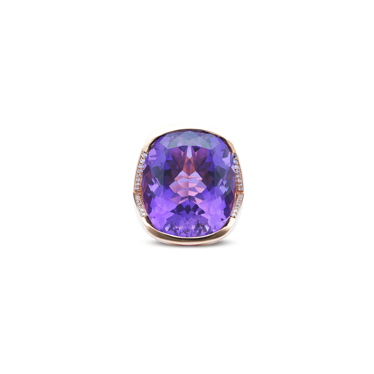 The "Ginger Viola" ring is crafted in 18-karat rose gold and set with 40 brilliant-shaped diamonds totalling 0.22 carats and a large cushion-shaped amethyst weighing 34.42 carats.