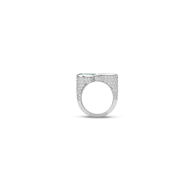 The "Mint Drop" ring is crafted in 18-karat white gold and is set with a drop- shaped mint-coloured tourmaline totalling 2.08 carats and a pink tourmaline, totalling 1.72 carats.