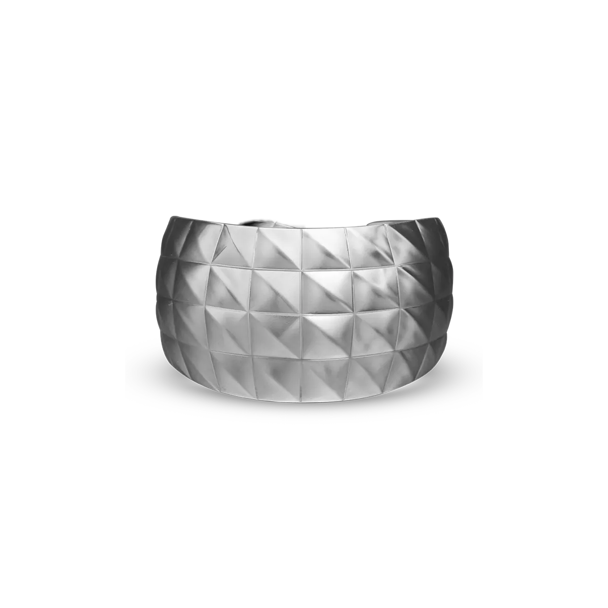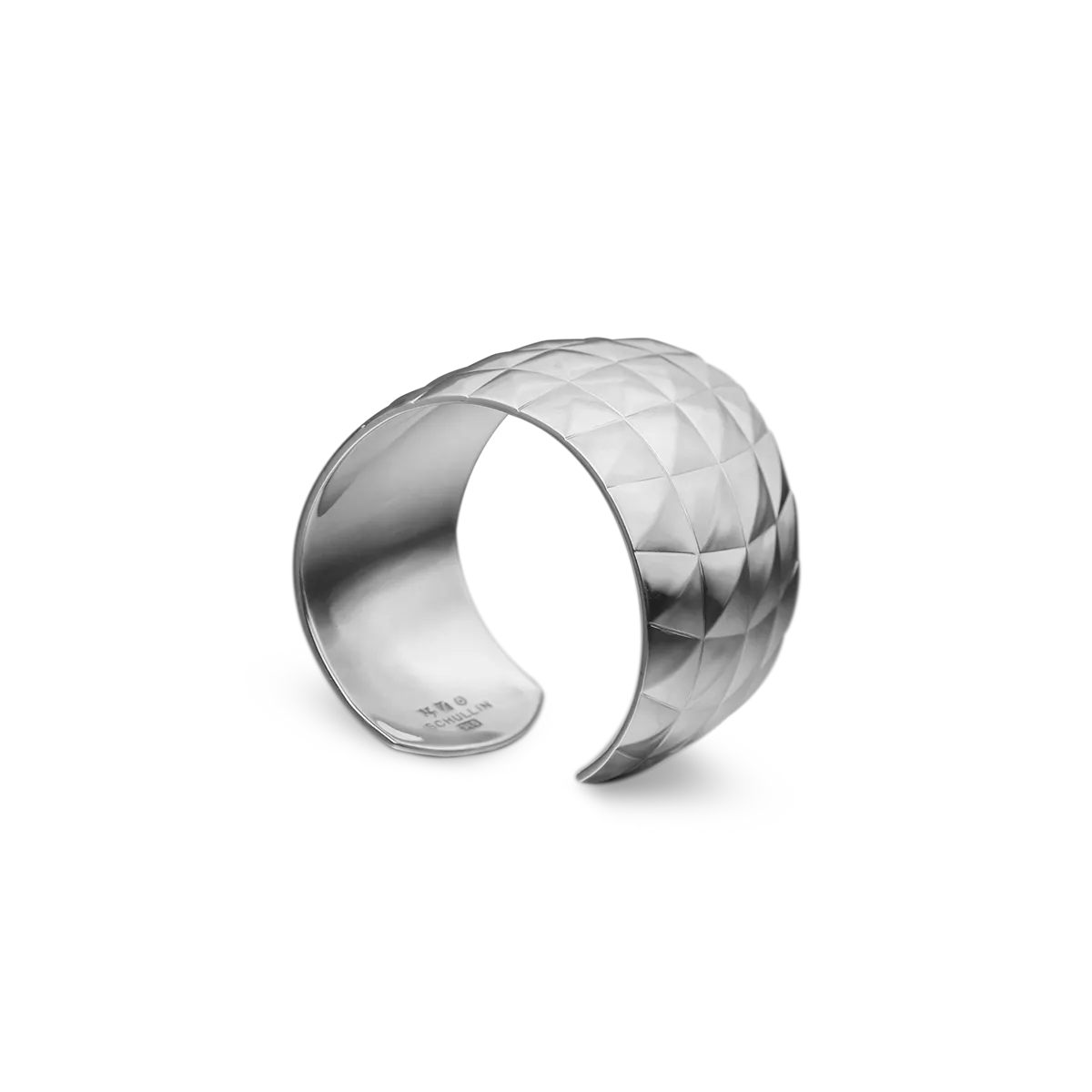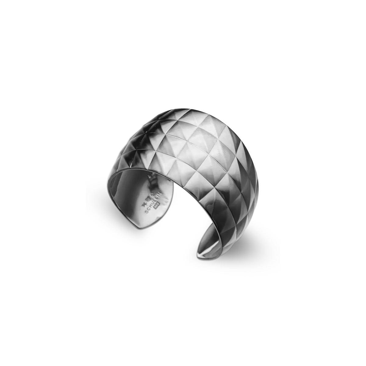 The “Vortex” bangle is crafted in silver and is distinguished by its striking, textured surface, which lends the design a powerful, sculptural depth.