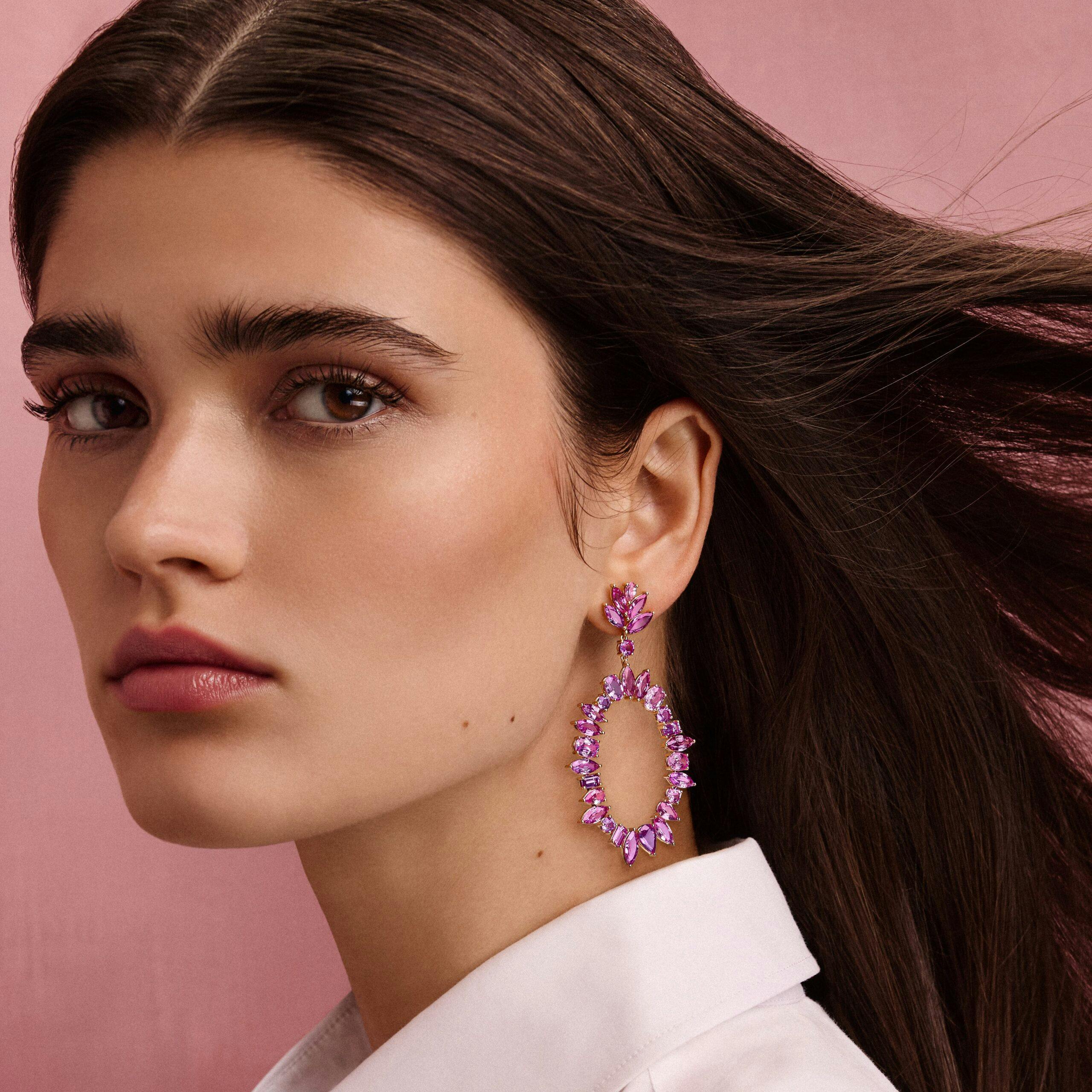 The "Thornelle" earrings are crafted in 18 karat rose gold and set with pink sapphires in various shapes totaling 31.40 carats.