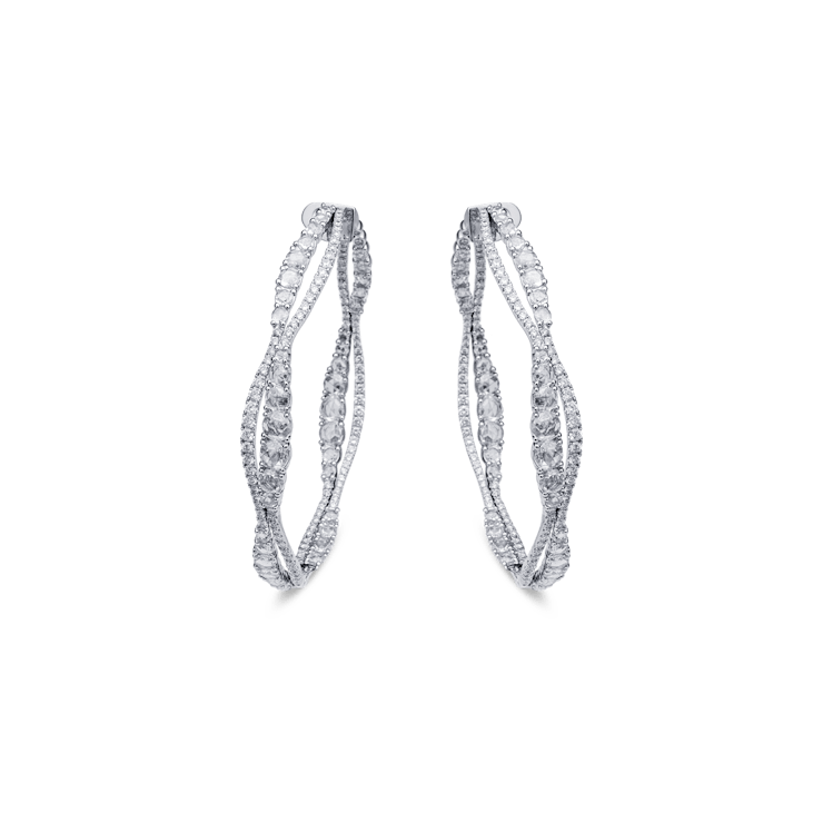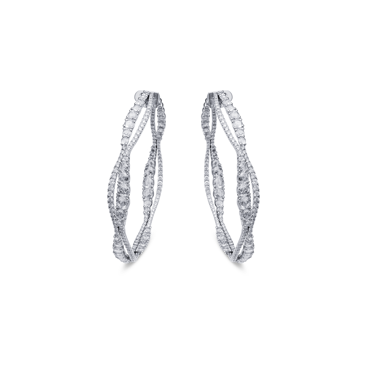 The "Torsade" earrings are crafted in 18-karat white gold and are set with 208 brilliant-shaped diamonds totalling 1.51 carats and 76 rose-shaped diamonds totalling 3.86 carats.