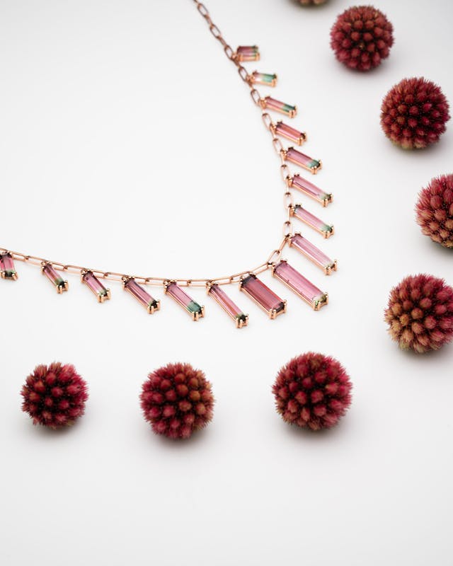 This necklace, crafted from exquisite 18-karat rose gold, showcases 18-00 carats of multicolor tourmalines that unfold a captivating play of colors with every movement. A luxurious and timeless piece of jewelry that seamlessly blends elegance and individuality.