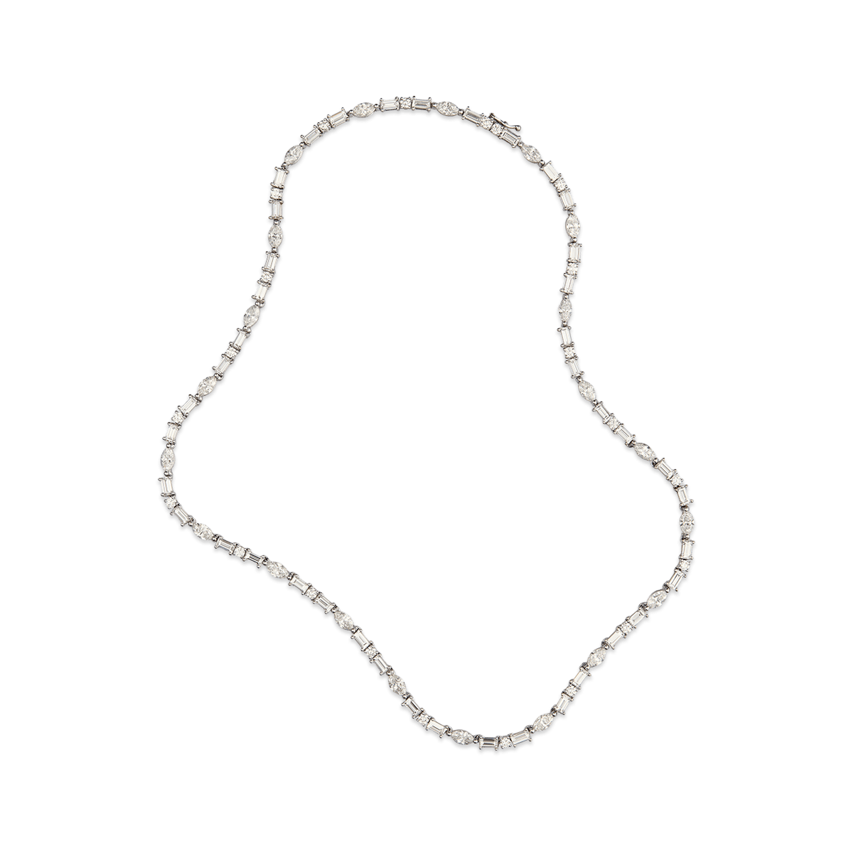 The "Tennis Misti III" necklace is crafted in 18-karat white gold and set with baguette-shape diamonds totaling 4.72 carats, navette-shape diamonds totaling 4.00 carats, and brilliant-shape diamonds totaling 1.10 carats.