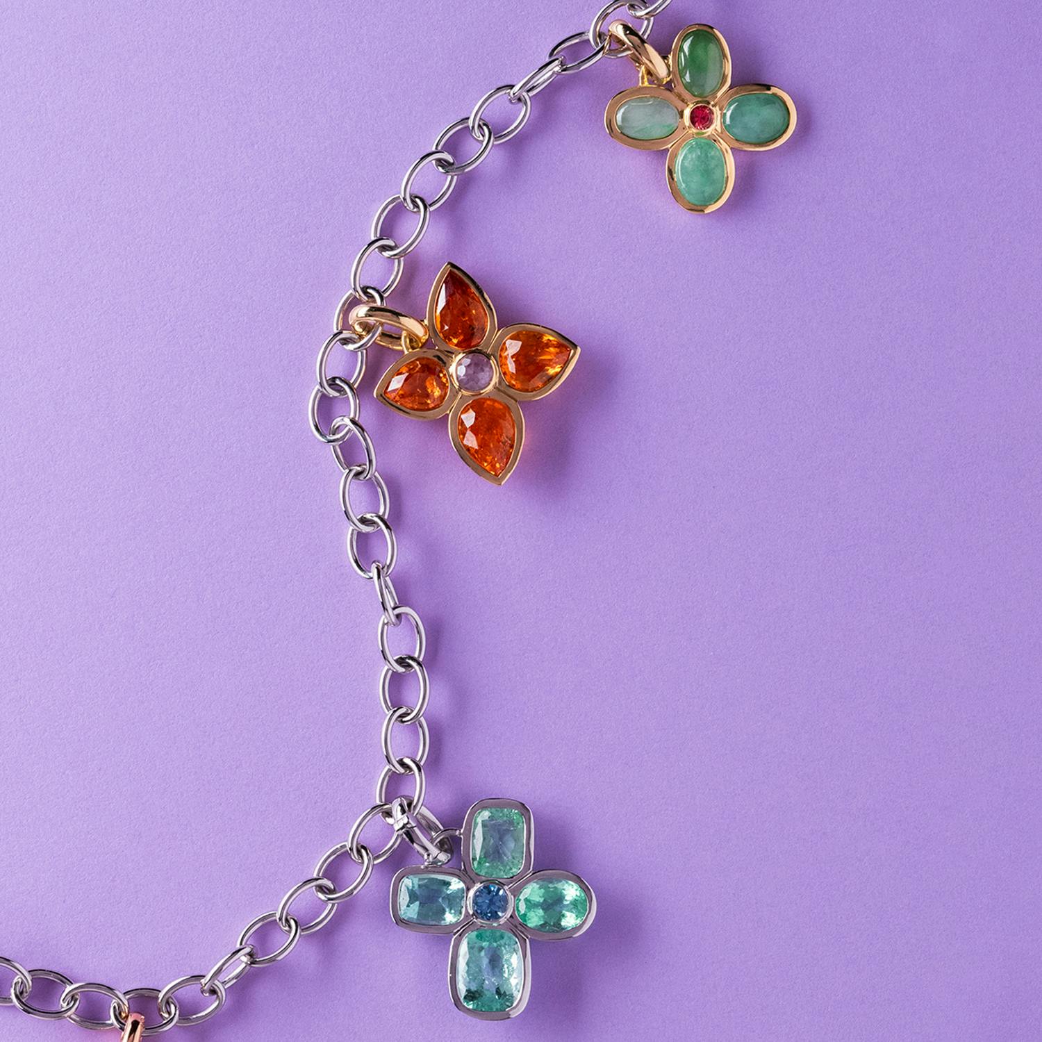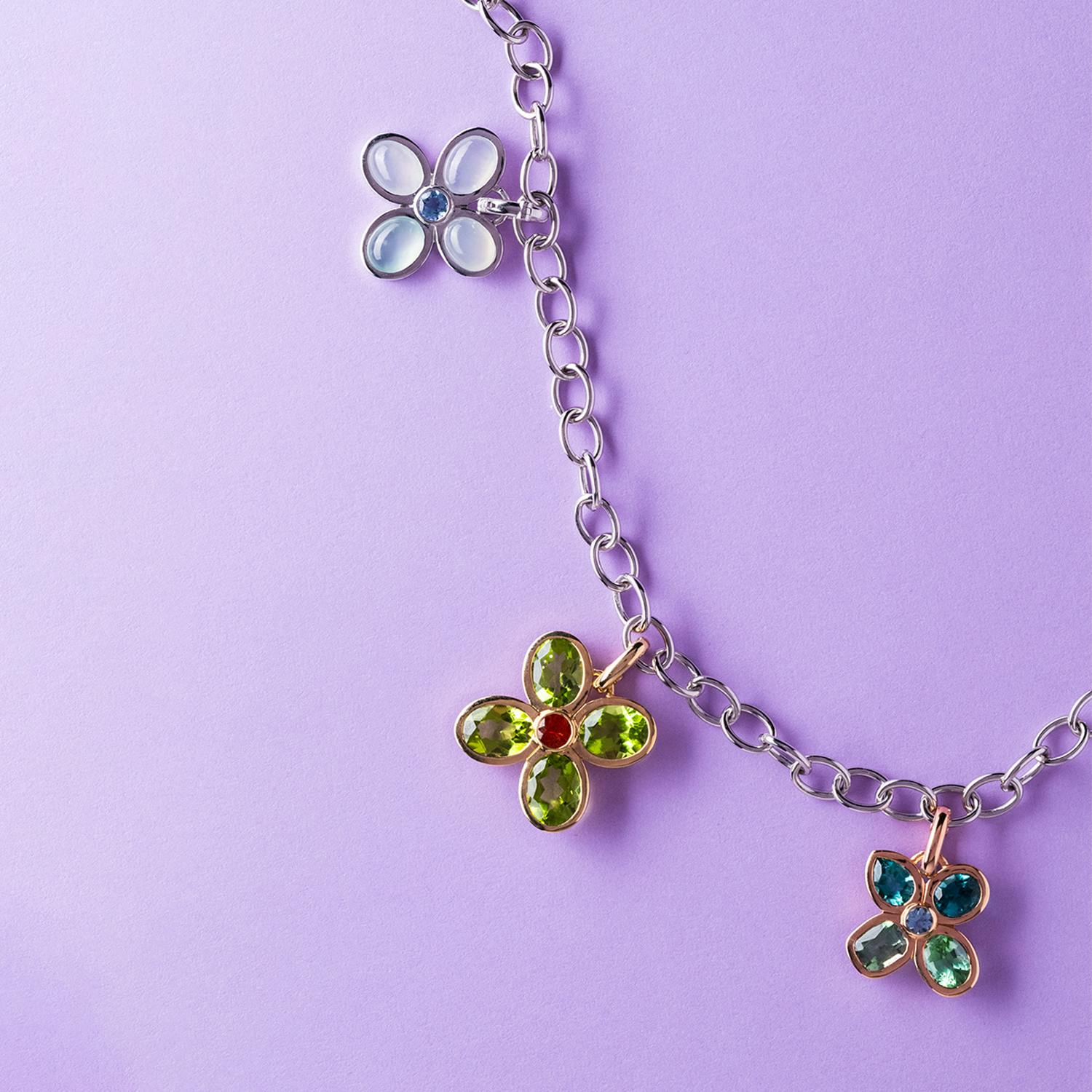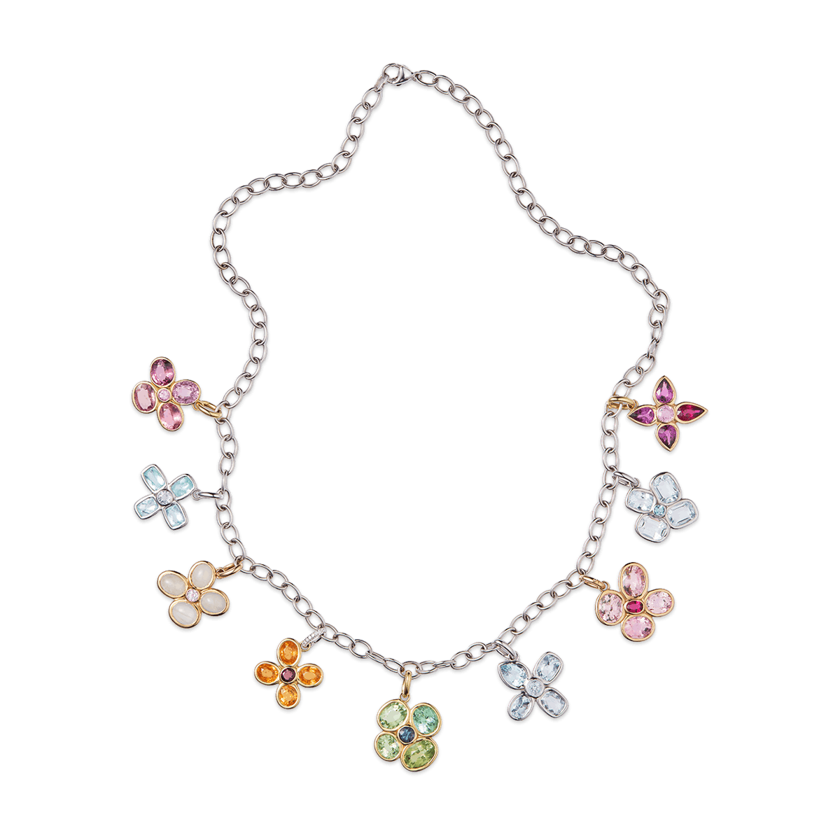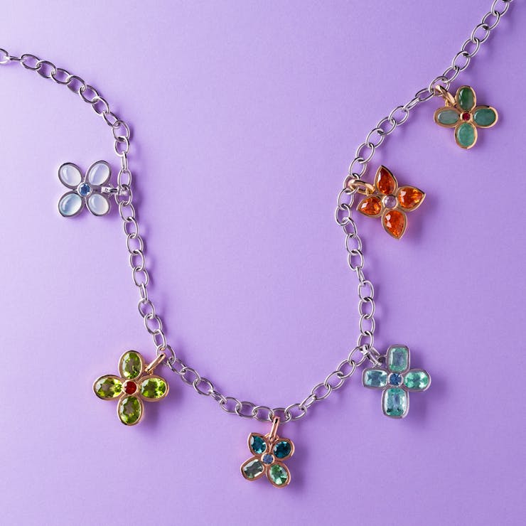 A series of handcrafted flower pendants, each set with gemstones in an extraordinary spectrum of colors. Sapphire, spinel, tourmaline, rhodolite, peridot, garnet, emerald, aquamarine and zircon appear in varying hues and carat sizes, creating a vibrant and unique composition. The pendants are crafted in 18-karat white, rose or yellow gold.