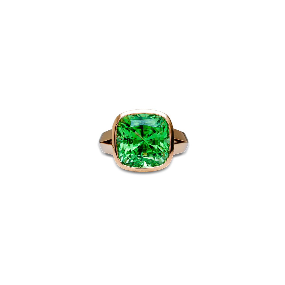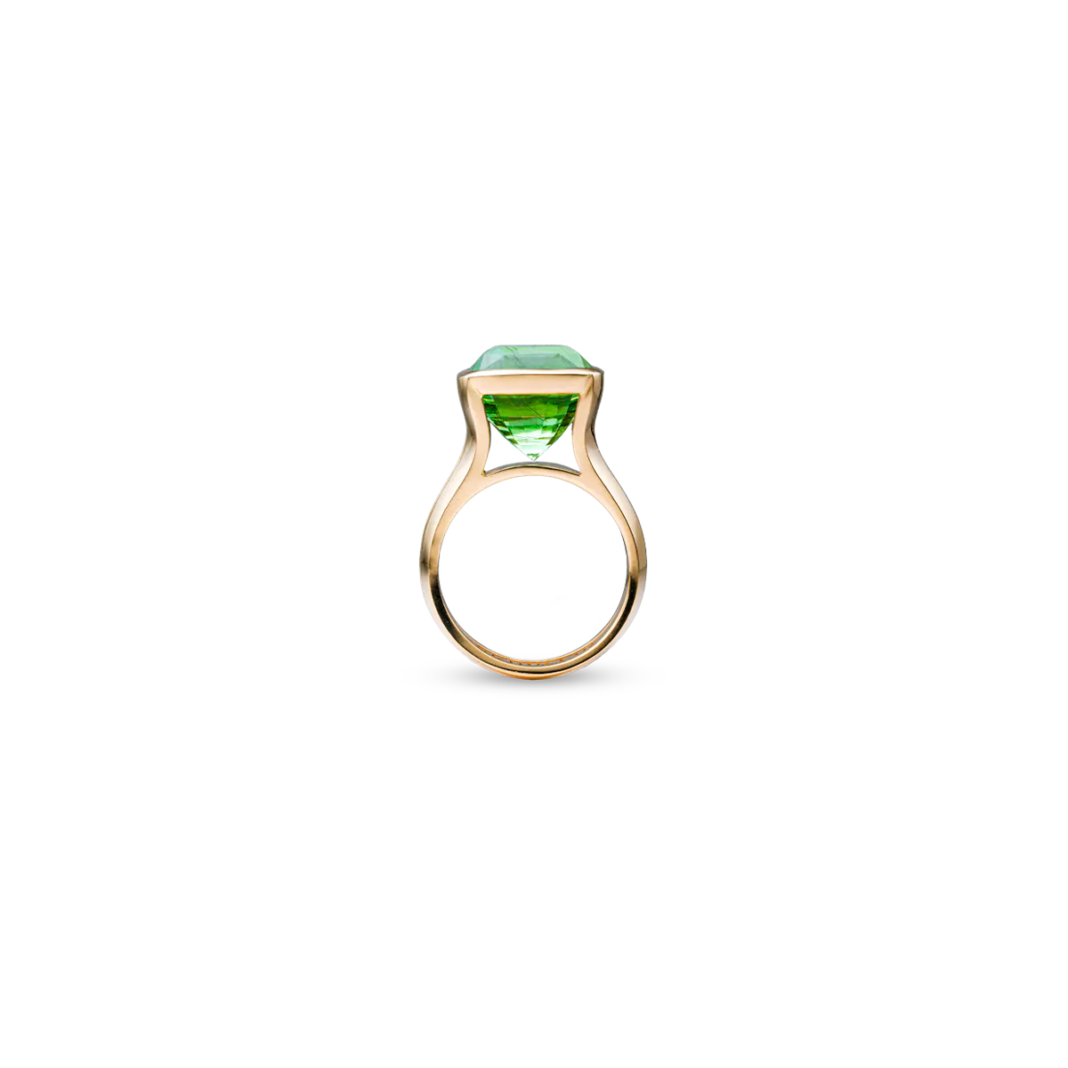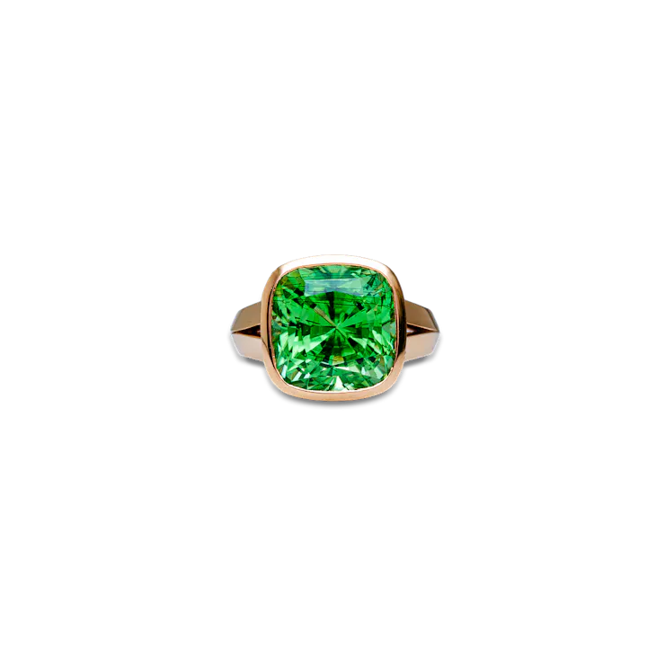 The “Encirra Verde” ring is crafted in 18-carat yellow gold and set with a green cushion-shaped peridot with a total weight of 11.07 carats.