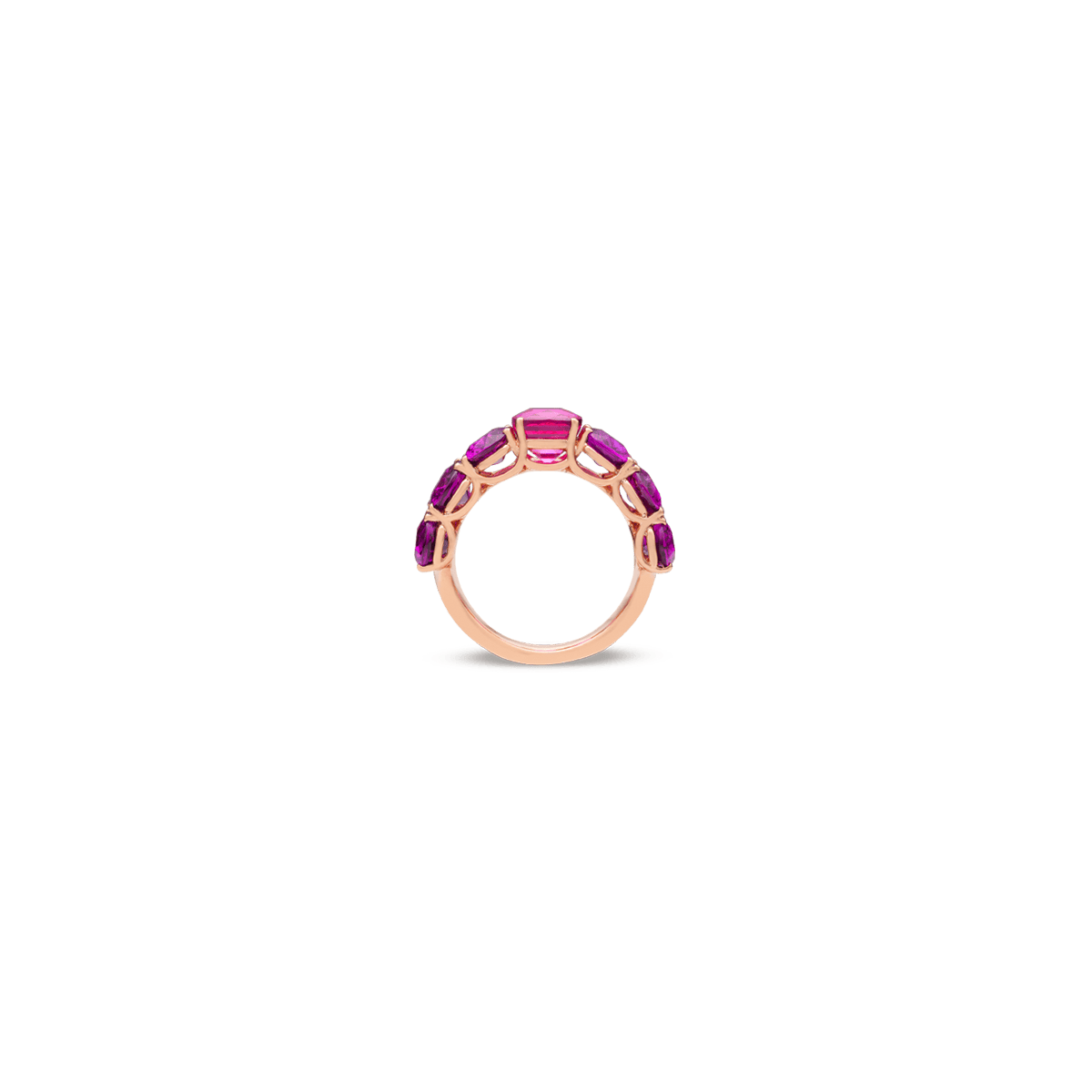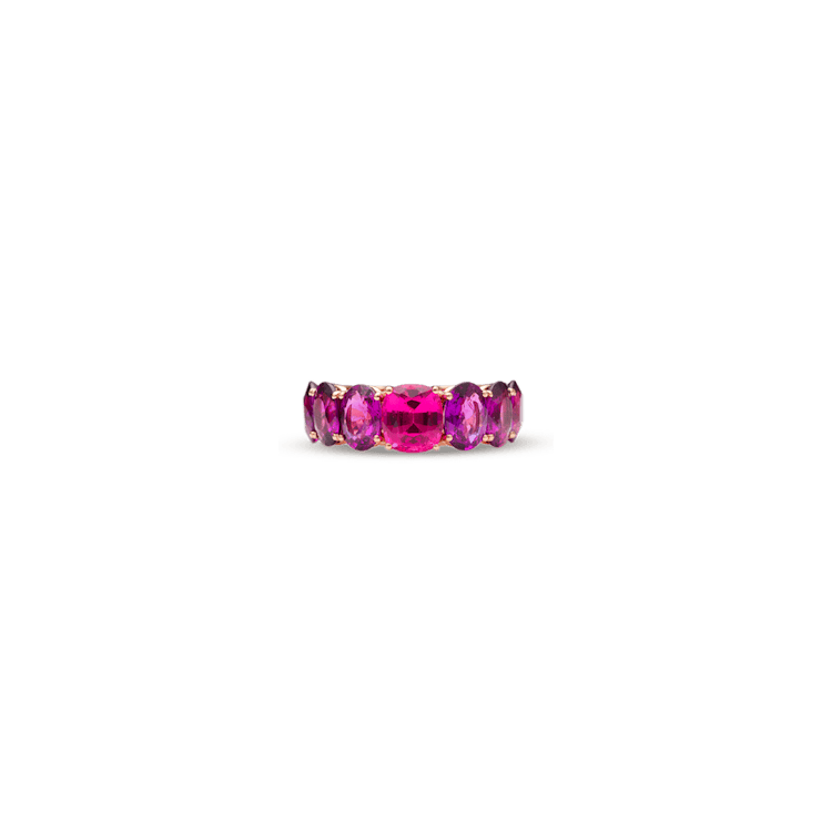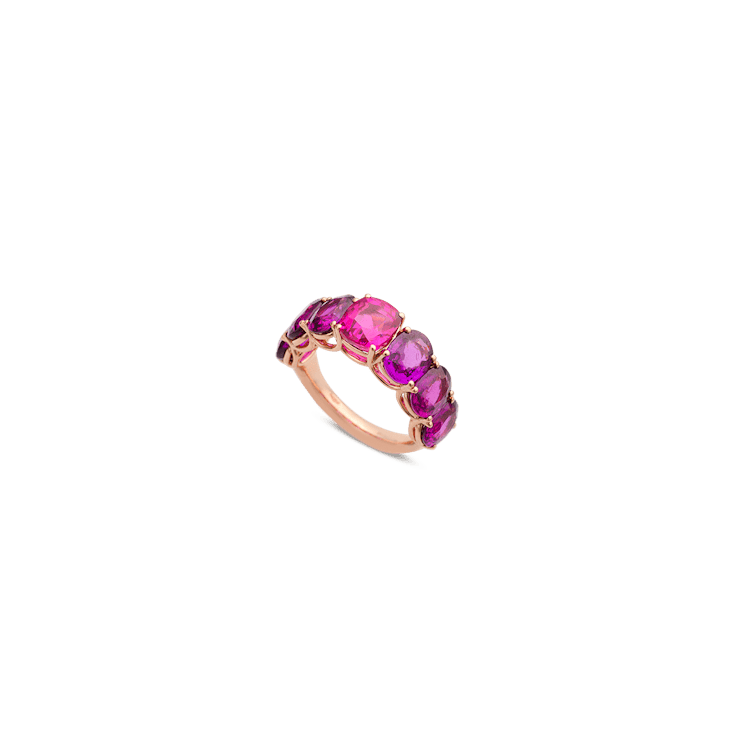 The "Memory Demi pink" ring is crafted in 18-karat rose gold and is set with six violet rhodolites totalling 9.52 carats and two cushion-shaped pink sapphires totalling 4.97 carats.