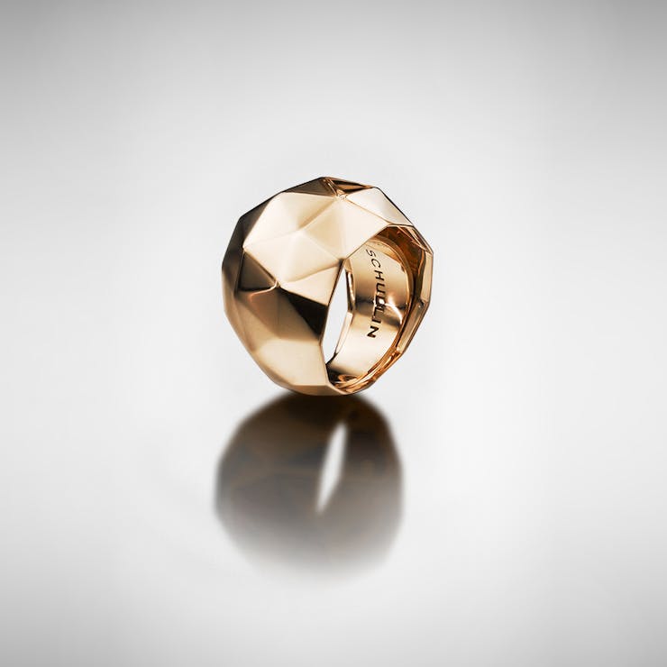 The Polygon rose, has a geometric shape as the name suggests, featuring three-sided polygons, that together form a much larger polygon. The ring is crafted in 18k rose gold and the flat surfaces have a polished finish. Flat surfaces that meet are very hard to polish by hand and requires a lot of careful labor, a true testament to the craftsmanship of this piece.