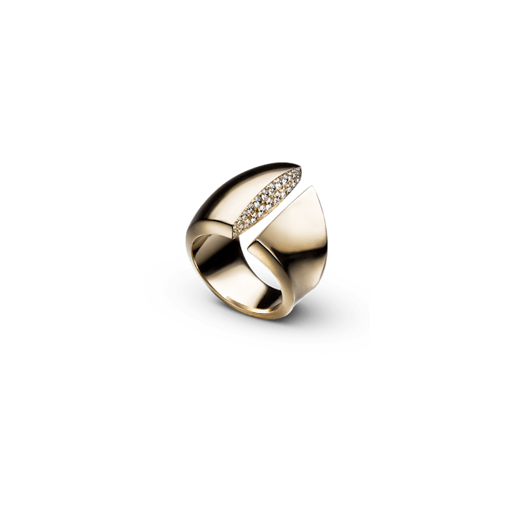 The "Trombone pavé rose" Ring prominently features a subtle yet complex transition from a concave to a convex surface on its exterior. This highlights the artful polishing that is required to create flawless mirror finishes on this 18k rosé gold surface, with constantly changing curvatures. An unconventionally placed gap at the zenith of the ring reveals a micro-pavé of G/VS diamonds, that seem impossible to set in such a tight space.