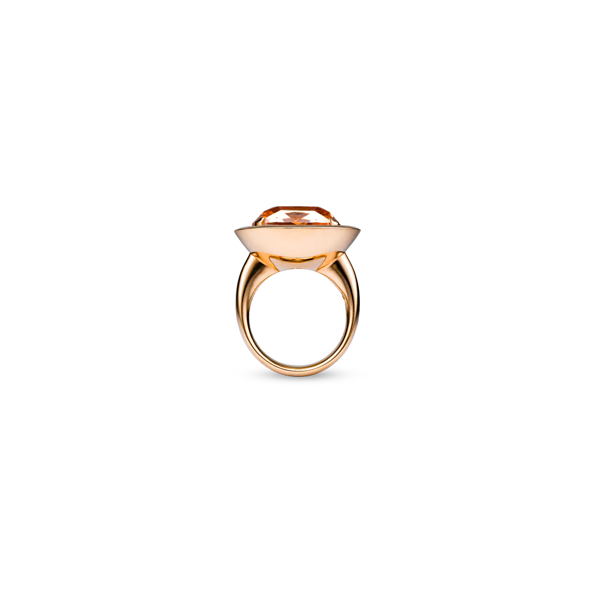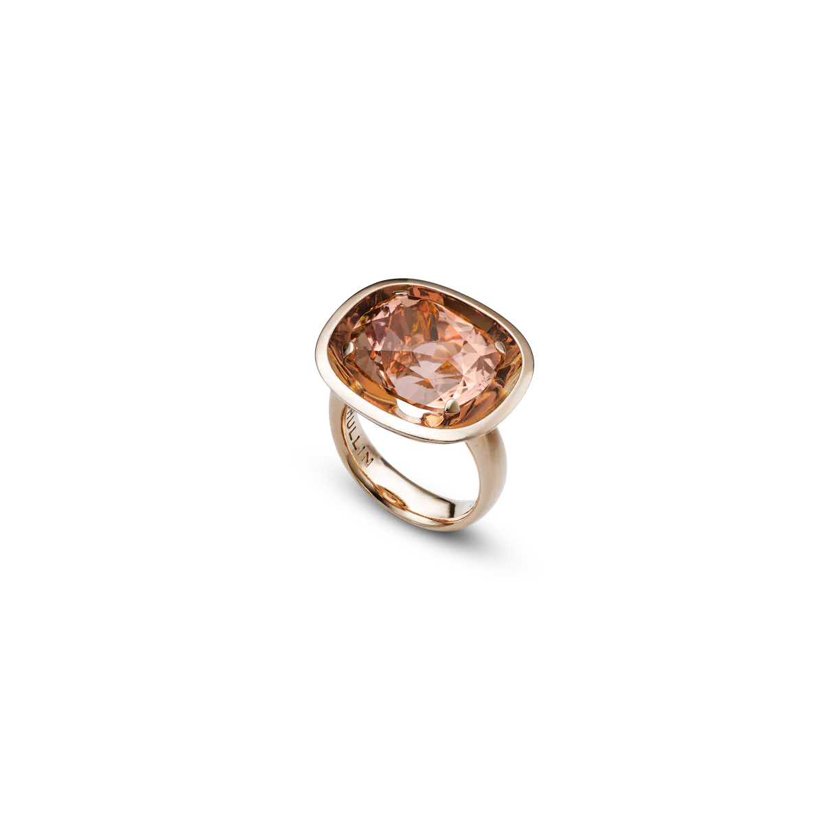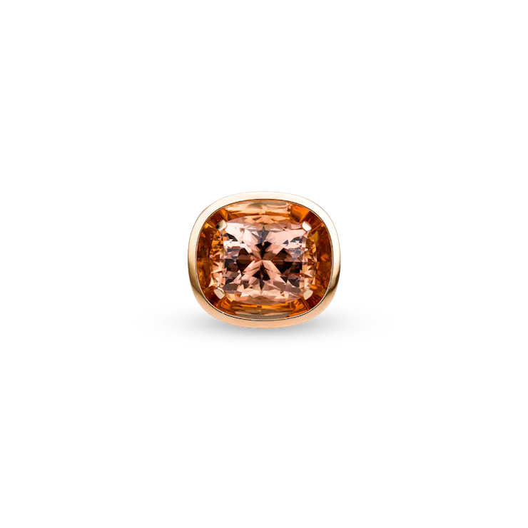The “Vasca” ring is crafted in 18-karat rose gold and set with a pink cushion-shaped topaz with a total weight of 17.12 carats, resting in a softly rounded, bowl-like setting that cradles the stone like a delicate basket.